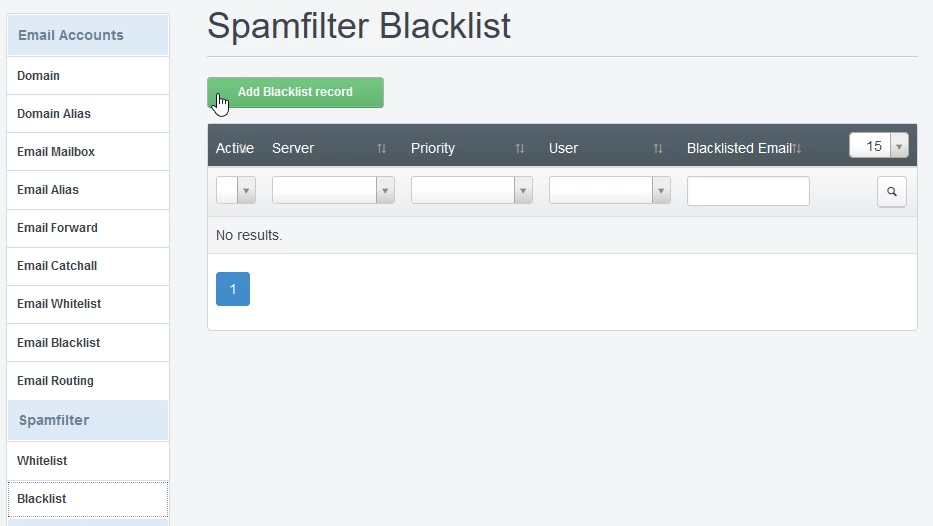 - Το μενού Blacklist στην ενότητα Spamfilter του ISPConfig μας επιτρέπει να χαρακτηρίζουμε οποιοδήποτε μήνυμα ληφθεί από ένα email inbox ως spam, ανεξαρτήτως αν είναι spam ή όχι.